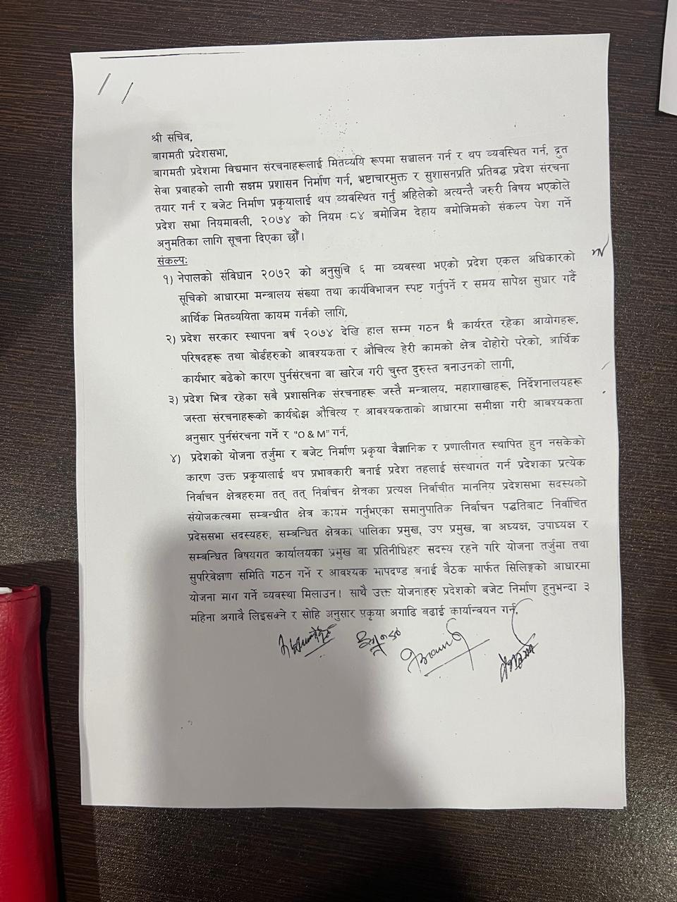 प्रदेश सभा सदस्यद्वय मधुसूदन पौडेल र रमेशकुमार महतको प्रस्ताव तथा प्रदेश सभामा सदस्यद्वय केशवप्रसाद पोखरेल र प्रभात तामाङको समर्थनमा सङ्कल्प प्रस्ताव प्रदेश सभामा पेश गरिएको थियो ।