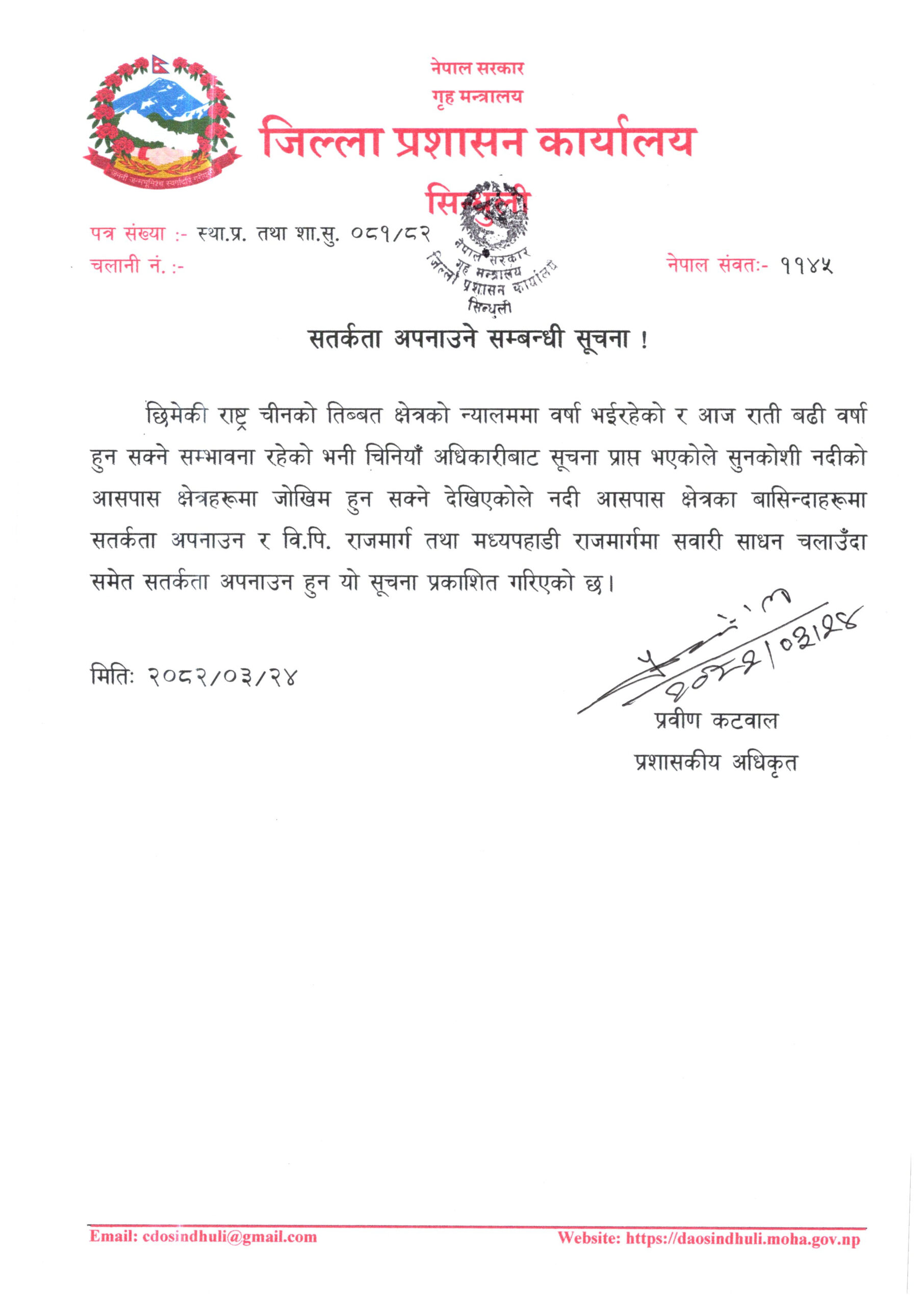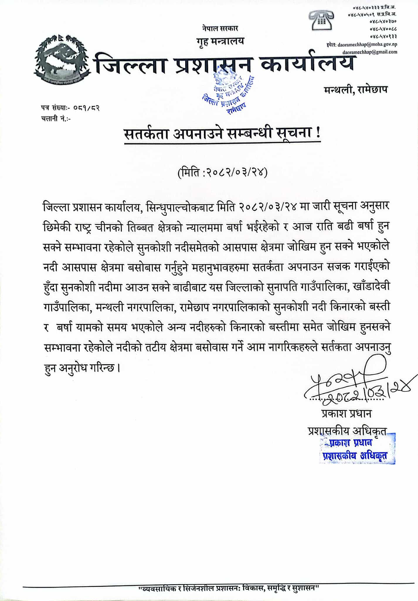 “छिमेकी राष्ट्र चीनको तिब्बत क्षेत्रको न्यालममा वर्षा भईरहेको र आज राति बढी वर्षा हुन सक्ने सम्भावना रहेको चिनियाँ अधिकारीबाट प्राप्त सूचनाका आधारमा भोटेकोशी र सुनकोशी नदी आसपासका क्षेत्रमा जोखिम बढ्न सक्ने भएकाले त्यहाँका बासिन्दाहरूलाई सतर्कता अपनाउन अनुरोध गरिन्छ।” प्रशासनले आज सार्वजनिक गरेको सूचनामा भनिएको छ,