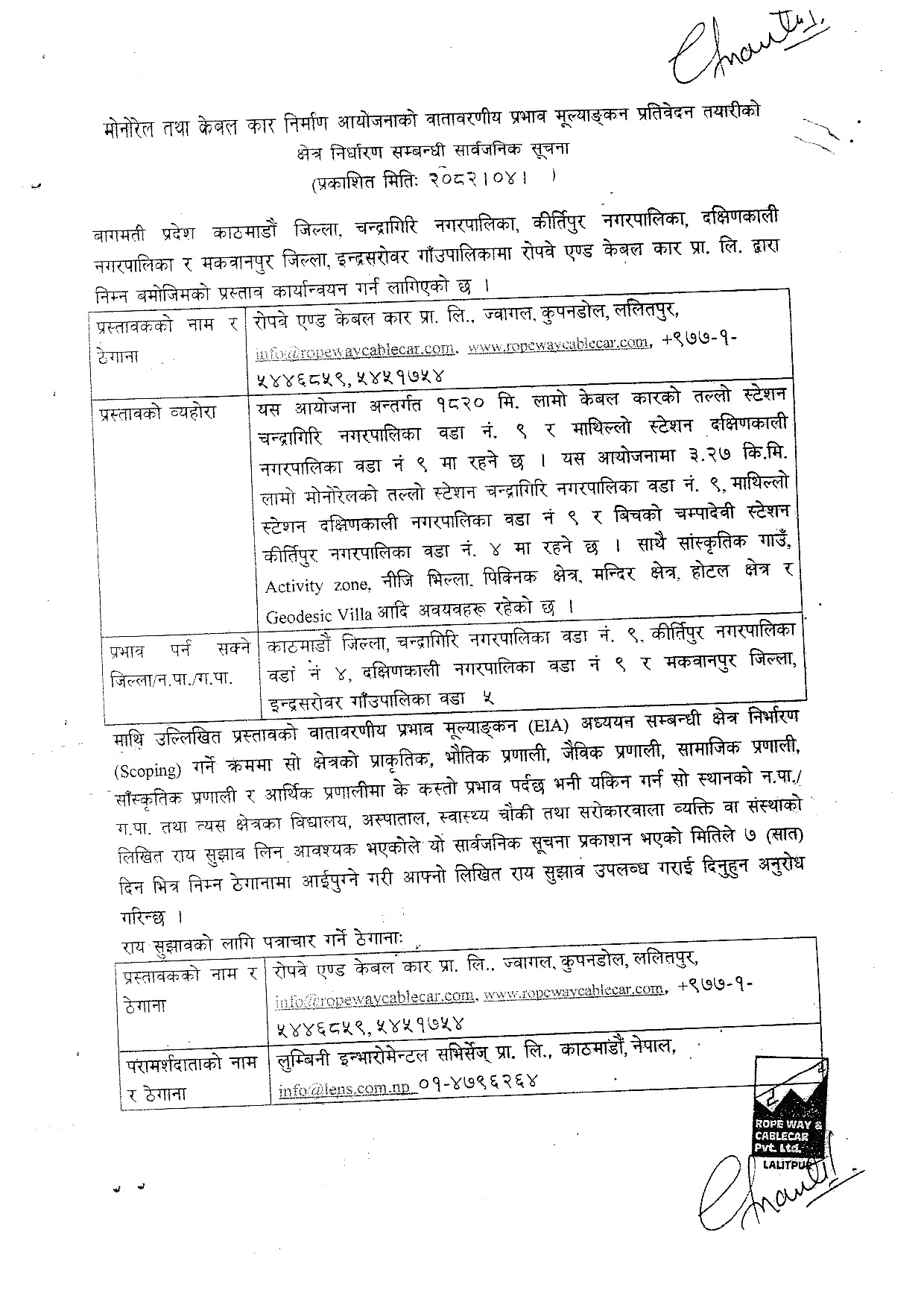 कम्पनीले मोनोरेल तथा केबल कार निर्माण आयोजनाको वातावरणीय प्रभाव मूल्याङ्कन प्रतिवेदन तयारीको क्षेत्र निर्धारणका लागि सार्वजनिक सूचना जारी गर्दै सुझाव माग गरेको छ ।