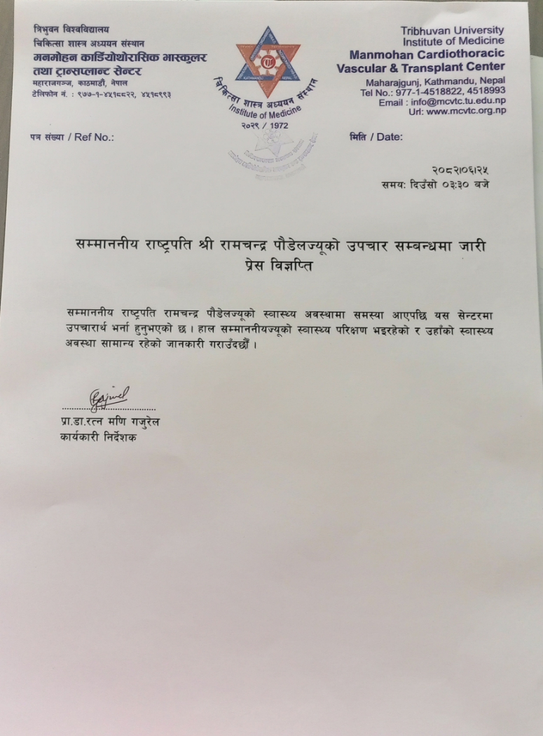 राष्ट्रपति पौडेलको महाराजगञ्जस्थित त्रिभुवन विश्वविद्यालय चिकिसाशास्त्र अध्ययन संस्थाको मनमोहन कार्डियोथोरासिक भास्कुलर तथा ट्रान्सप्लान्ट सेन्टरमा उपचार भइराखेको छ।