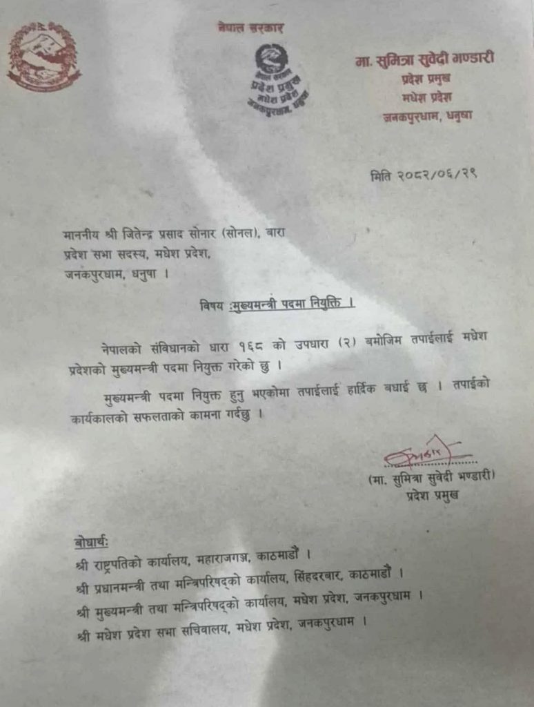 जनकपुरधाम, असोज २९ गते । मधेश प्रदेशका चौथो मुख्यमन्त्री पदमा लोकतान्त्रिक समाजवादी पार्टी नेपालका नेता जितेन्द्र सोनार (सोनल) नियुक्त हुनु भएको छ । मधेश प्रदेशका प्रदेश प्रमुख सुमित्रा सुवेदी भण्डारीले नेपालको संविधानको धारा १६८ को उपधारा (२) अनुसार पाँच राजनीतिक दलको ५६ जना प्रदेश सभा सदस्यहरूको समर्थन प्राप्त गर्नु भएकाले मधेश प्रदेशका मुख्यमन्त्रीमा सोनार नियुक्त हुनु भएको मधेश प्रदेश प्रमुखको कार्यालयका निमित्त सचिव शत्रुधन यादवले आज साँझ जारी गर्नु भएको प्रेस विज्ञप्तिमा उल्लेख रहेको हो ।