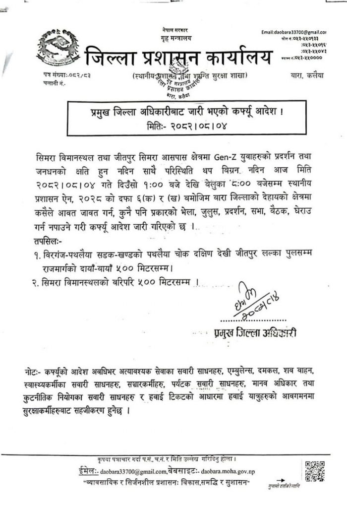 स्थानीय प्रशासनले जारी गरेको कफ्र्यू आदेशमा वीरगञ्ज–पथलैया सडक खण्डको पथलैया चोक दक्षिणदेखि जीतपुर लल्का पुलसम्म राजमार्गको दायाँ–बायाँ ५०० मिटरसम्म र सिमरा विमानस्थलको वरिपरि ५०० मिटरसम्म कुनै पनि प्रकारको भेला, जुलुस, प्रदर्शन, सभा, बैठक, घेराउ लगायतका कार्यक्रम गर्न प्रतिबन्ध लगाइएको छ ।