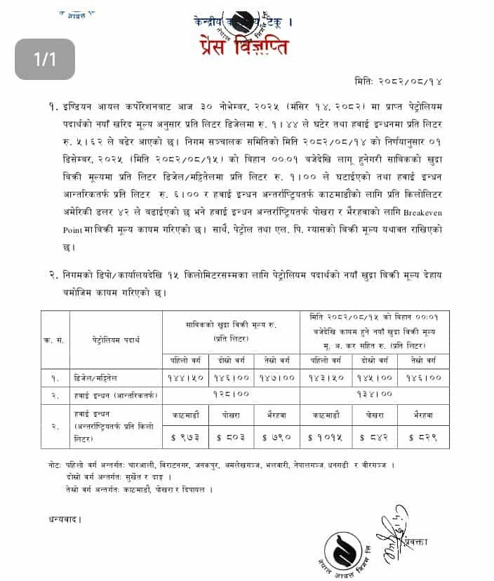 काठमाडौँ, मङ्सिर १४ गते । नेपाल आयल निगमले डिजेल र मट्टितेलको मूल्य घटाएको छ । निगम सञ्चालक समितिको बैठकले आइतबार मध्यरातदेखि लागू हुने गरी डिजेल/मट्टितेलमा प्रतिलिटर रु एक घटाएको हो ।