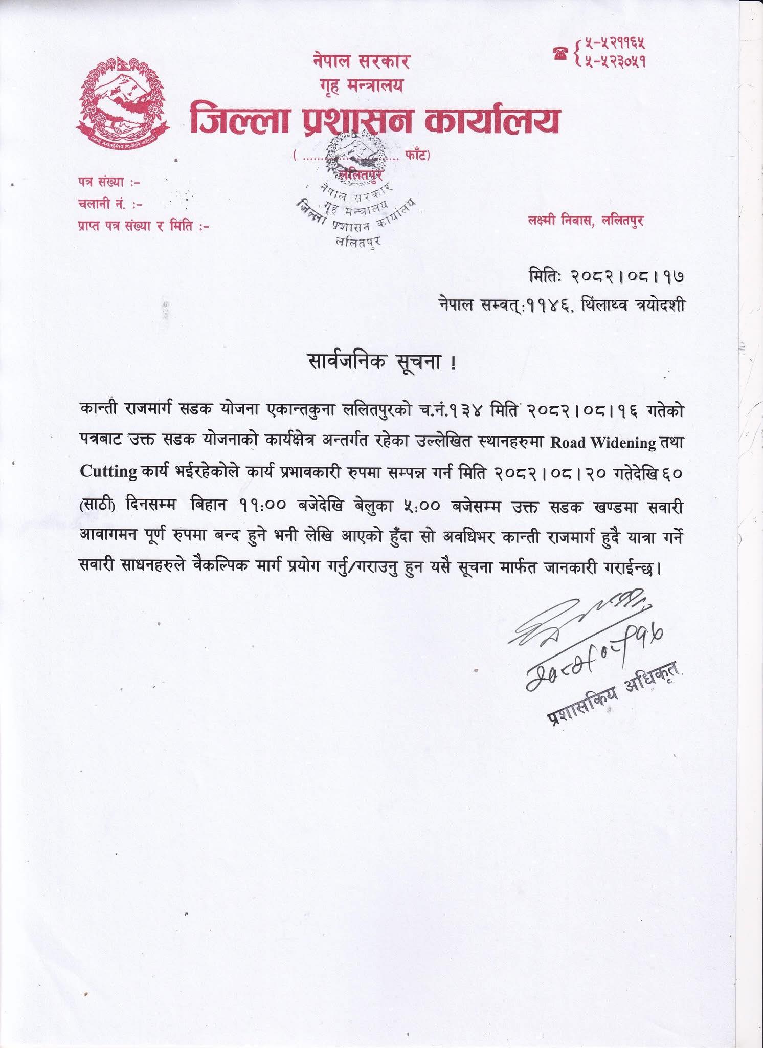 जिल्ला प्रशासन कार्यालय ललितपुरले एक सूचना जारी गर्दै कान्ति राजमार्ग सडक योजना एकान्तकुना ललितपुर अन्तर्गतको सडक खण्ड सडक चौडा गर्न कटिङ् गर्नुपर्ने भएकोले मङ्सिर २० गतेबाट ६० दिन सवारी साधन पूर्ण रुपमा आवागमन बन्द हुने जनाएको छ ।