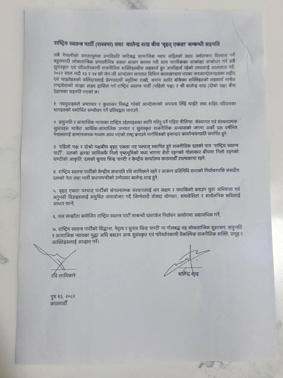 आइतबार भएको सात बुँदे सहमतिपत्रमा रवि लामिछाने र बालेन्द्र शाहले हस्ताक्षर गर्नुभएको छ ।