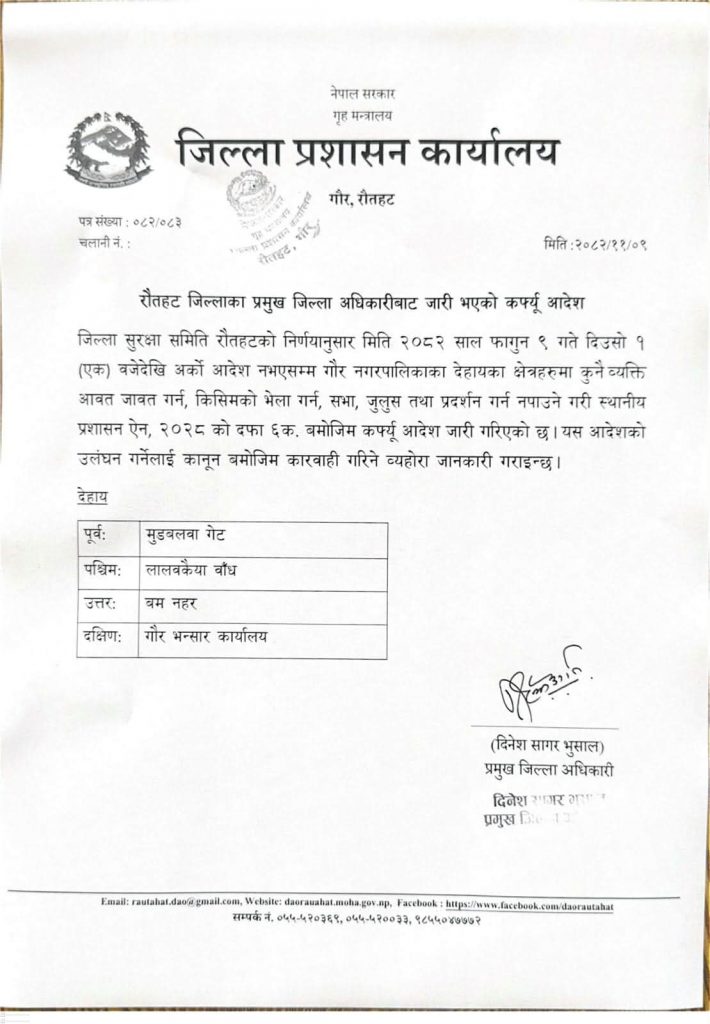 रौतहट, फागुन ९ गते । जिल्ला प्रशासन कार्यालय रौतहटले सदरमुकाम गौरमा कर्फ्यु आदेश जारी गरेको छ । जिल्ला सुरक्षा समिति रौतहटको निर्णय अनुसार शनिबार दिउँसो १ बजे देखि अर्को आदेश नहुन्जेल सम्मको लागि कफ्र्यु आदेश जारी गरिएको रौतहटका प्रमुख जिल्ला अधिकारी दिनेश सागर भुषालले जानकारी दिनुभयो । पूर्वमा मुडवलबा गेट, पश्चिममा लालबकैया बाँध, उत्तरमा बम नहर र दक्षिणमा गौर भन्सार कार्यालय क्षेत्रमा कफ्र्यु लगाइएको उहाँले बताउनुभयो ।