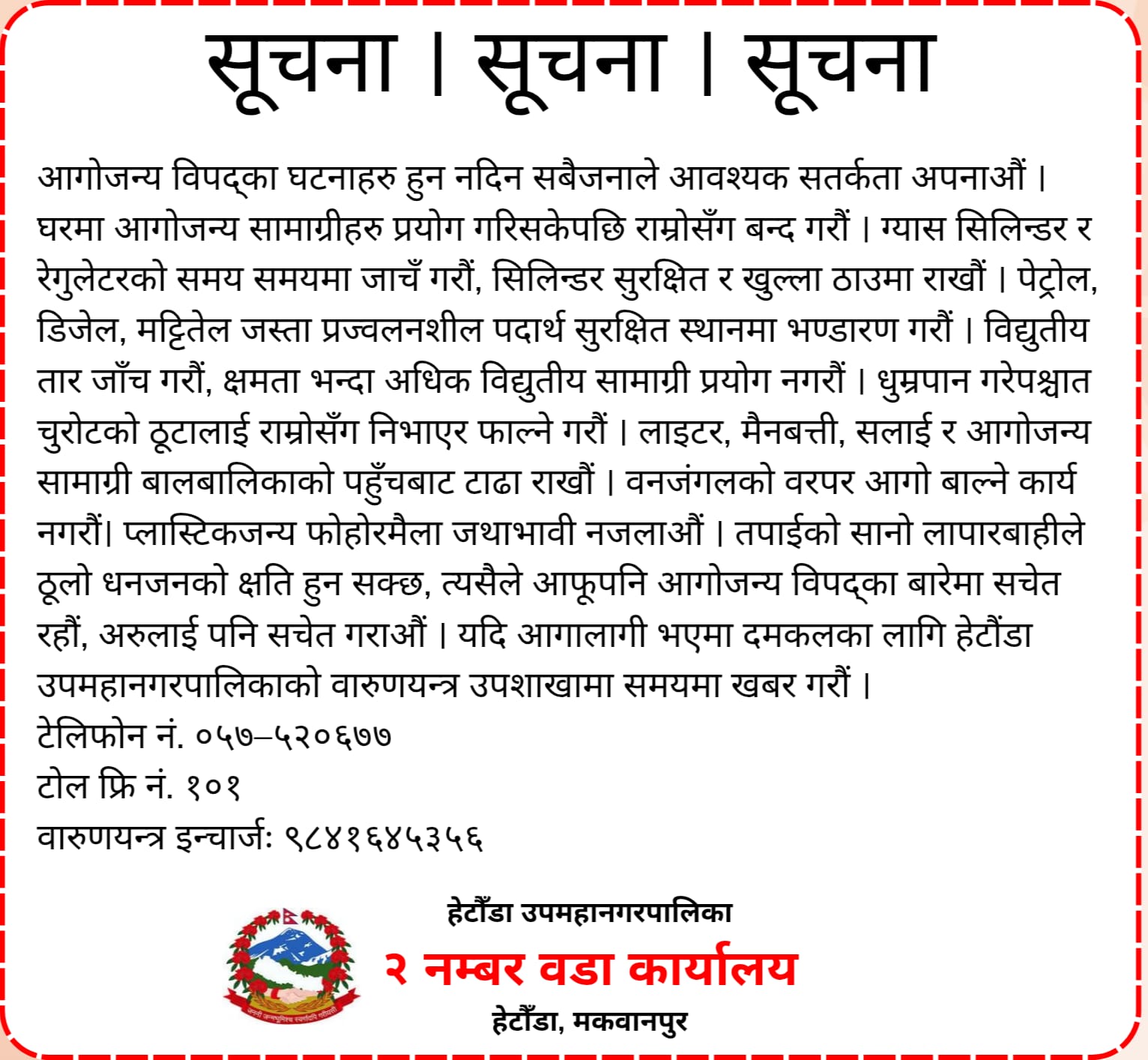 नगरपालिकाका प्रमुख प्रशासकीय अधिकृत गणेशराज कार्कीले बिहीबार ‘अत्यन्त जरुरी सूचना’ जारी गर्दै रोगको थप फैलावट रोक्न र सर्वसाधारणको स्वास्थ्य सुरक्षाका लागि विभिन्न ७ बुँदे निर्देशनहरू पालना गर्न आग्रह गर्नुभएको छ । नगरपालिकाले अर्को सूचना जारी नभएसम्मका लागि प्रभावित क्षेत्रबाट कुखुरा, अन्डा, मासु, दाना र फार्ममा प्रयोग हुने उपकरणहरूको ओसारपसारमा पूर्ण प्रतिबन्ध लगाएको छ । कुखुरापालक कृषकहरूलाई आफ्ना फार्ममा अनावश्यक व्यक्तिको प्रवेशमा रोक लगाउन र प्रवेश तथा निकास बिन्दुमा चुना, फिनेल, स्यानिटाइजर वा साबुन पानी जस्ता निःसङ्क्रामक वस्तुहरूको अनिवार्य प्रयोग गर्न निर्देशन दिएको छ ।
