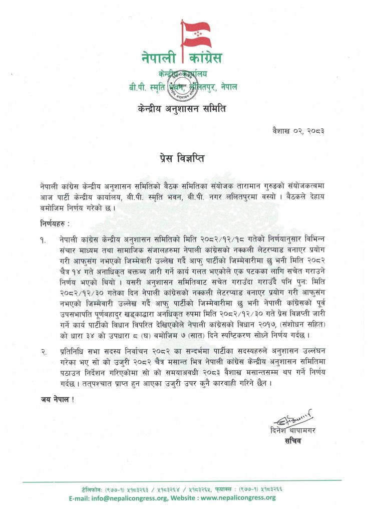यसअघि पार्टीले सचेत गराउँदा गराउँदै पनि खड्काले कार्यवाहक सभापतिको हैसियतमा पटकपटक विज्ञप्ति जारी गर्दै आउनु भएको अनुशासन समितिले पनि यसरी विज्ञप्ति जारी नगर्न सचेत गराएको थियो। चैत ३० गते फेरि विज्ञप्ति जारी गरेपछि समिति बैठकले आज खड्कालाई स्पष्टीकरण सोध्ने निर्णय गरेको हो। ‘अनधिकृत रुपमा मिति २०८२/१२/३० गते प्रेस विज्ञप्ति जारी गर्ने कार्य पार्टीको विधान विपरित देखिएकोले नेपाली कांग्रेसको विधान २०१७, (संशोधन सहित) को धारा ३४ को उपधारा ८ (घ) बमोजिम ७ (सात) दिने स्पष्टिकरण सोध्ने निर्णय गर्दछ,’ अनुशासन समिति सभापति गुरूङले भन्नुभयो।